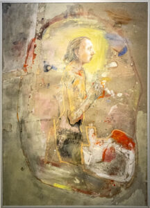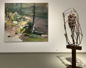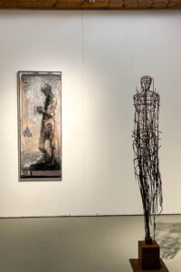 Der WANDERER sichtend, als Suchender, taucht neben den Landschaftsräumen, Köpfen und Körpern immer wieder in meinen Arbeiten auf. Papier, Farbe, schwarze Kreide, Stahl, Gußhaut – die Sinnlichkeit der Materialien bieten ein Universum an Möglichkeiten. Der Rucksack füllt sich. Der Proviant ist reichlich. Zweifel und Scheitern, Zerstören und Aufbauen begleiten den Weg, doch ebenso die Momente des Glücks an der Grenze des Sagbaren.“