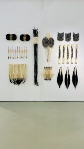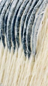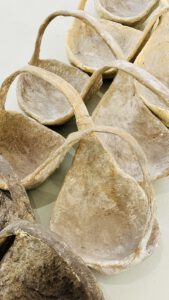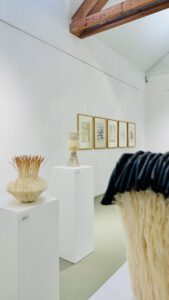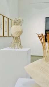 Hannelore Weitbrecht arbeitet mit feinem Seidenpapier. Hieraus erschafft sie faszinierende Objekte und Installationen in sinnbildhafter Ausdeutung zu dem in der Natur Gesehenen: zu Pflanzen, Blüten, Blättern, Früchten. Gelegentlich werden auch Fundmaterialien wie Schoten oder Zweige eingearbeitet. Im Schichten und Formen des Papiers offenbaren sich Strukturen analog zur Natur, die fern aller Abbildhaftigkeit auf Essenzielles verweisen: auf die Bewegtheit im Aufwachsen, das sich stärkende Miteinander der einzelnen Elemente, die Fragilität der Schöpfung, die eine besondere Achtsamkeit fordert. In ihrer Arbeitsweise reflektiert die Künstlerin oft das Tun des Menschen, seinen Einfluss auf die Gestaltung der Erde durch Säen und Ernten, aber auch seinen Drang zu sammeln, zu sortieren, zu bündeln, zu lagern und ein naturwissenschaftliches Ordnungssystem aufzubauen. Objekte, die an den Erntezyklus erinnern, greifen Formen archaischer Gerätschaften auf.
