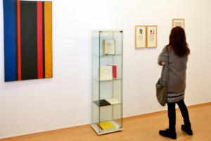 Freunden und Kennern der Buchkunst ist er vor allem als Gründer der „edition fundamental“ ein Begriff: ein Herausgeber neuer und vor allem konkreter Poesie, der selbst im Handsatz druckte und die visuellen und spatialen Texte ebenso wie Zeichnungen der Autoren kongenial umsetzte. Herausragend sind seine Editionen von Wladimir Majakowski, Pierre und Ilse Garnier, Eugen Gomringer und anderen. Christian Morgensterns Galgenlieder hat er mit eigenen Zeichnungen illustriert. Mit gleicher Präzision und Geisteswitz hat er eigene Texte und Graphiken ediert. Immer war ihm die Einheit von Bild und Text, von Illustration und Typographie wichtig. Innovativ, kreativ und experimentierfreudig ging er zu Werke. Das Buch „Staubsinn“ von Manfred Bartling, von dem die Kunststation ein Exemplar besitzt, druckte Müller mit Dreck aus dem Staubsaugerbeutel. Vom Einband bis zur letzten Seite: höchste Buchkunst jenseits der Massenproduktion. Und darüber hinaus hat Richard Müller auch noch als Maler und Graphiker beeindruckende Werke konkreter Kunst geschaffen, die im Fuldaer Landkreis bislang nur selten zu sehen waren.