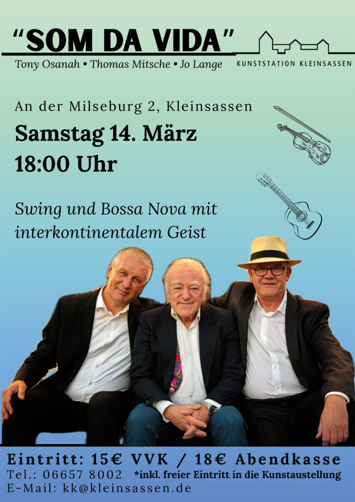 Mit Som da Vida ist an diesem Abend ein Trio zu Gast, das Musik als lebendige Reise versteht. Som da Vida – der „Klang des Lebens“ – verbindet Swing, Bossa Nova, Blues, Latin, Weltmusik und klassische Elemente zu einem offenen, atmosphärischen Klangbild. Los geht es um 18 Uhr. Eintritt: VVK 15 Euro, Abendkasse 18 Euro.